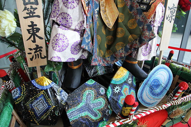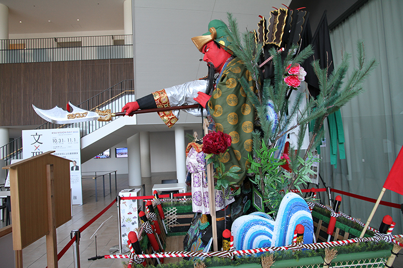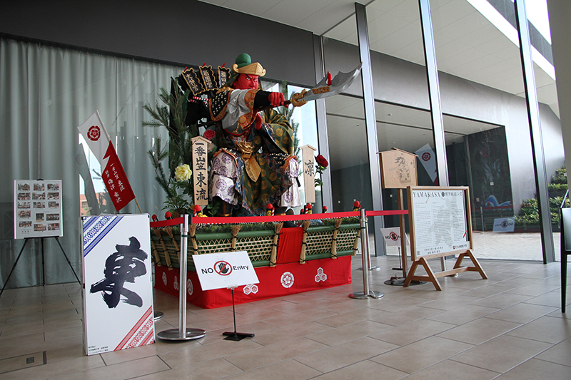 まず九州産業大学(福岡市東区松香台)の大楠アリーナ1階ロビーにて、今年の一番山笠・東流の舁き山笠の学内展示が行われています。