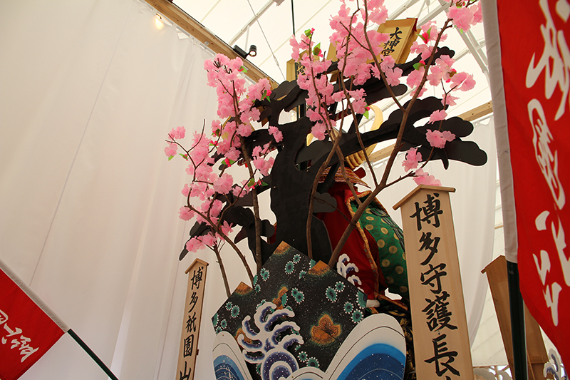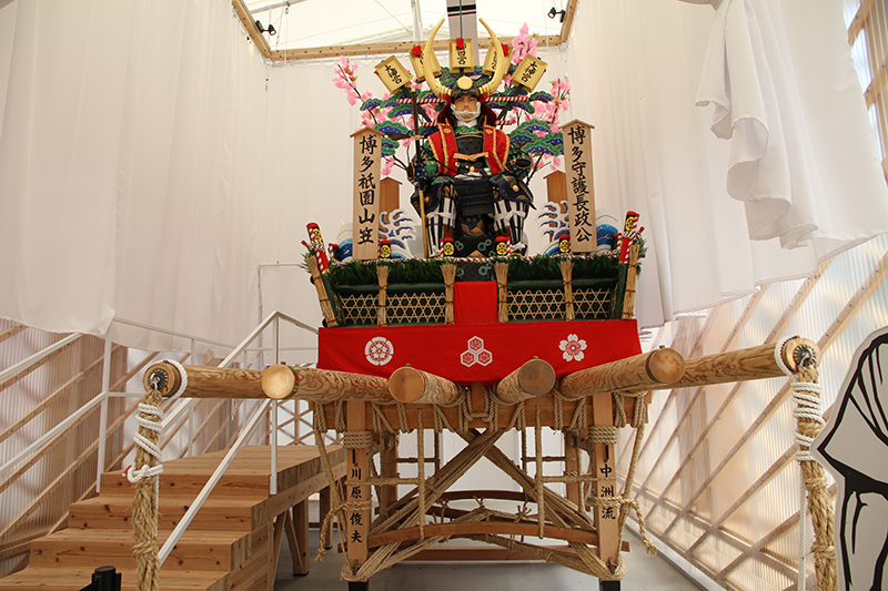 中に入ると、ふくやさんが2013年にオリジナルで製作した舁き山笠が鎮座。中村信喬人形師が製作した、標題「博多守護長政公(はかたのしゅごながまさこう)」です。