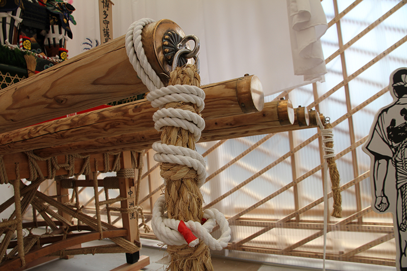 立入禁止のロープも飾りから近い場所に張られているという事もあり、かなり間近に人形や飾りを見る事が出来、細かいところまで作り込まれた様子を見る事が出来ます。また、山笠台がない事から滅多に見ることがない足元の飾りの様子なども見る事が出来、大変貴重な展示です。