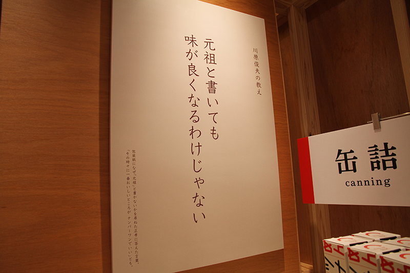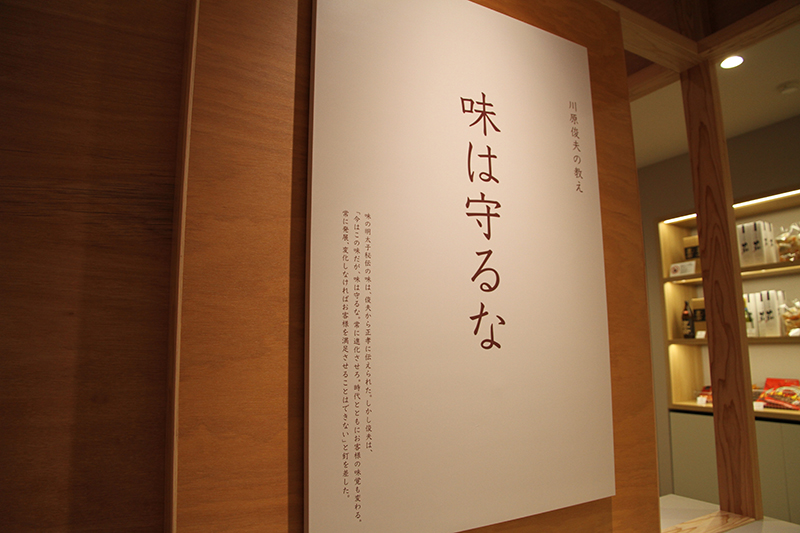 施設内には、ドラマや映画で話題になった「めんたいぴりり」でも再現された、ふくやのお店も一部再現されており、様々な所に創業者・川原俊夫さんの金言が紹介されています。