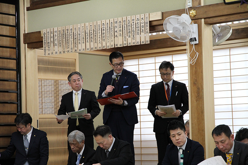 総会では、振興会本部役員の紹介が行われた後、各流の番付が読み上げられ、全会一致で了承を受けました。