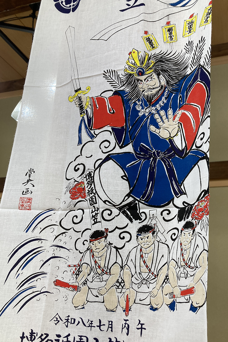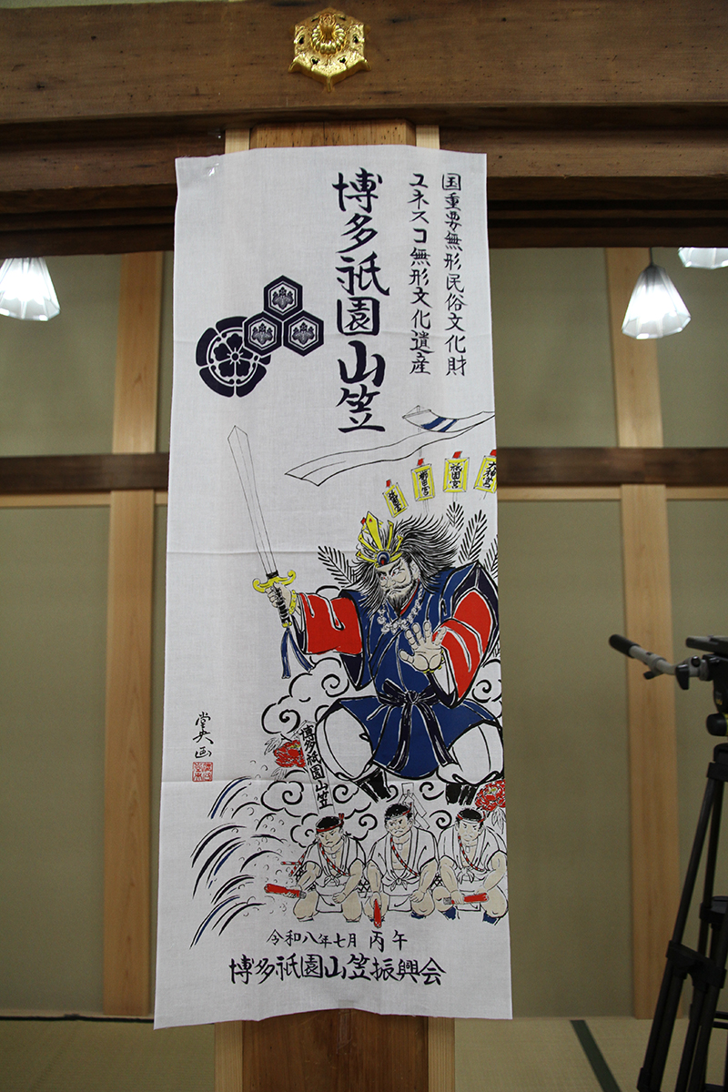また、今年の博多祇園山笠記念手拭のデザインが発表され、会場に掲示されました。手拭のデザインは今年の一番山笠中洲流の舁き山笠を担当する溝口堂央人形師がデザインした物です。