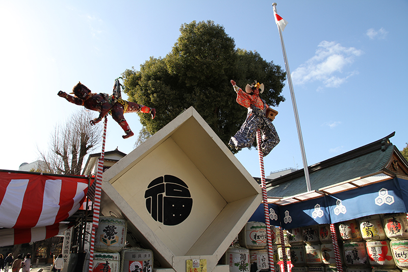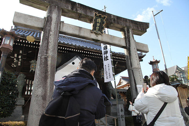 九州と言えども福岡の冬はやはり寒い。太陽が町を照らすも、最高気温9度の博多の町。博多総鎮守・櫛田神社は2月3日行われる節分大祭の装いに。毎年恒例の山門に飾られる大お多福面が参拝客を出迎え、多くの人が写真に収めていました。