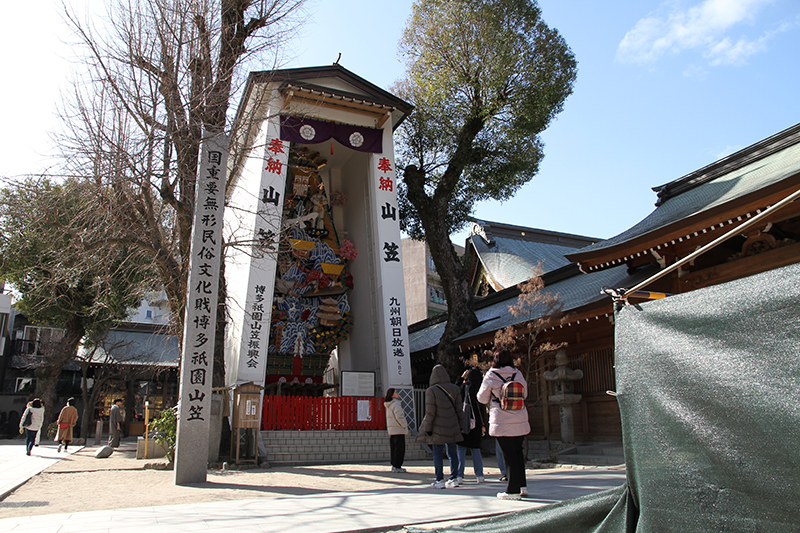 飾り山笠にも多くの人が訪れます。ほとんどの人達がその大きさに驚きながら手にしたスマートフォンで撮影する姿が見られました。