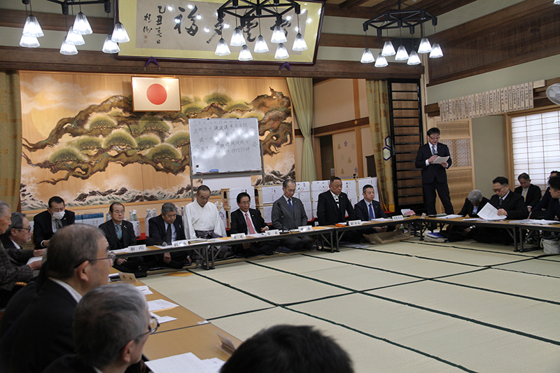15時から始まる総会には、博多祇園山笠振興会の役員を始め、今年の各流の総務や役員が全員集まり、今年最初の総会に臨みました。総会前には、今年初めて顔を合わせる人も多く、朗らかに新年の挨拶を交わす光景が数多く見られ、山笠行事が始まる高揚感を楽しんでいるようでした。