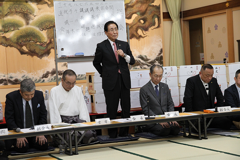 この三つの柱を実現することで、舁き手が誇りを持ち、山笠が千年も万年も続いていくと信じております。揺るがぬ伝統、揺るがぬ山笠こそ私の目指すところでございます。今後、博多祇園山笠振興会会長としての責務を全うしていきたいと思います。ご理解と御協力の程宜しくお願い致します。」